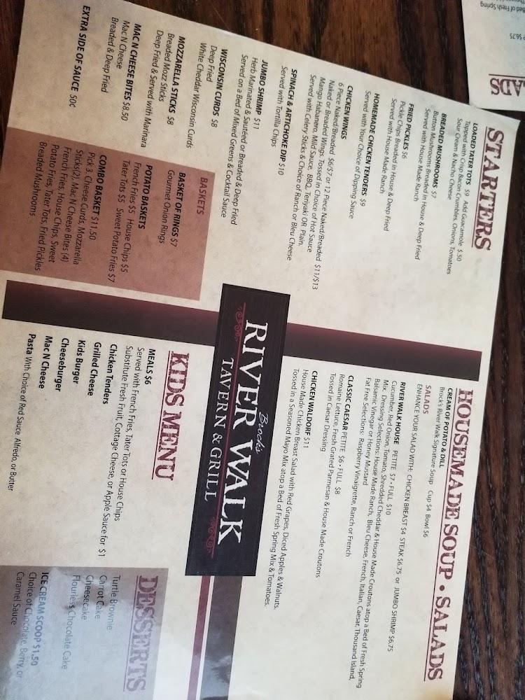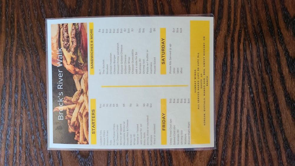 The menu at Brock's River Walk Tavern & Grill features a variety of comforting American dishes. Signature items include beer-battered fish and delicious burgers. On Fridays, taste the popular fish fry; Saturdays invite guests to indulge in prime rib. Sundays shine with a great pound of wings special.
